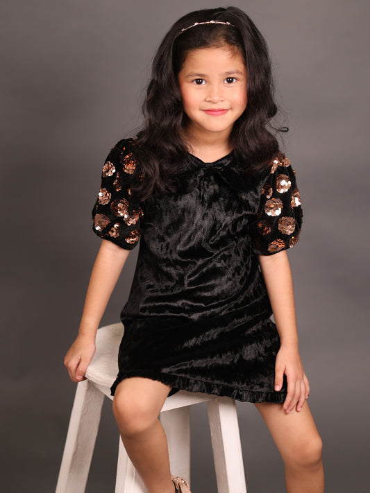 Girls' Black Velvet A-Line Dress with Peter Pan Collar, Floral Sequin Sleeves & Frill Detail