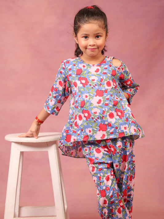 Girls' Floral Printed Cotton Loungewear Set with Frill Detailing