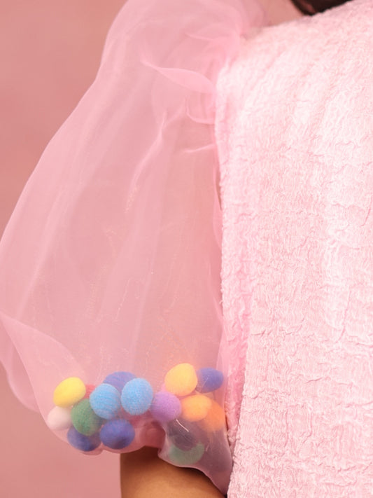 Pink Textured Co-Ord Set for Girls - Puff Sleeves & Pom-Pom Details
