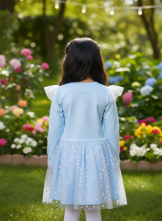 Girls' White Sequin Dress with Tulle Frills on Sleeves – Perfect for Parties & Special Occasions